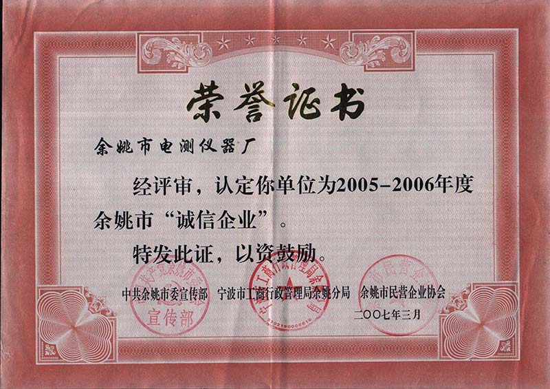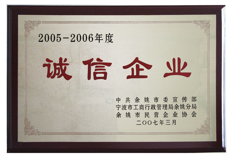 2007年3月,被中共余姚市委宣傳部、寧波市工商行政管理局余姚分局、余姚市民營企業(yè)協(xié)會聯(lián)合評定為2005-2006年度“誠信企業(yè)”