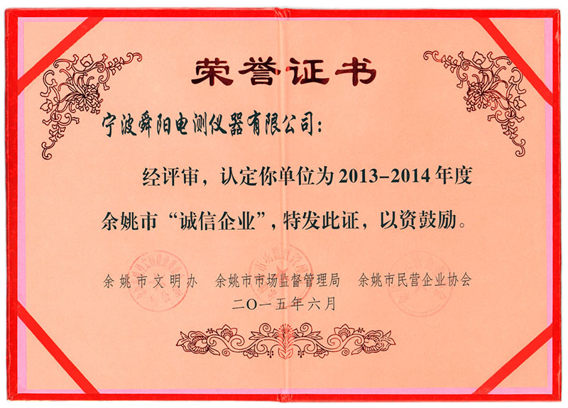 2015年6月,被余姚市文明辦、余姚市市場監(jiān)督管理局、余姚市民營企業(yè)協(xié)會聯(lián)合評定為2013-2014年度余姚市“誠信企業(yè)”
