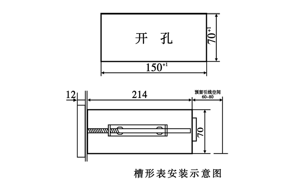 DT1/C系列電壓監(jiān)測儀采用鐵質(zhì)外殼噴塑涂復(fù),其盤面和嵌入部分的截面的大小與許多儀表一致,便于安裝其外形尺寸為160×226×80mm3,安裝時(shí)的開孔尺寸和安裝方法見下圖: