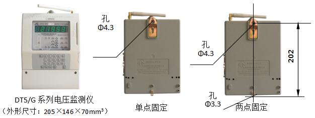DT5/G系列電壓監(jiān)測儀的外形如下圖所示,它通常采用單點固定(掛孔上部寬4mm),也可以采用兩點固定。采用兩點固定時,其上下兩點之間的距離為202mm。